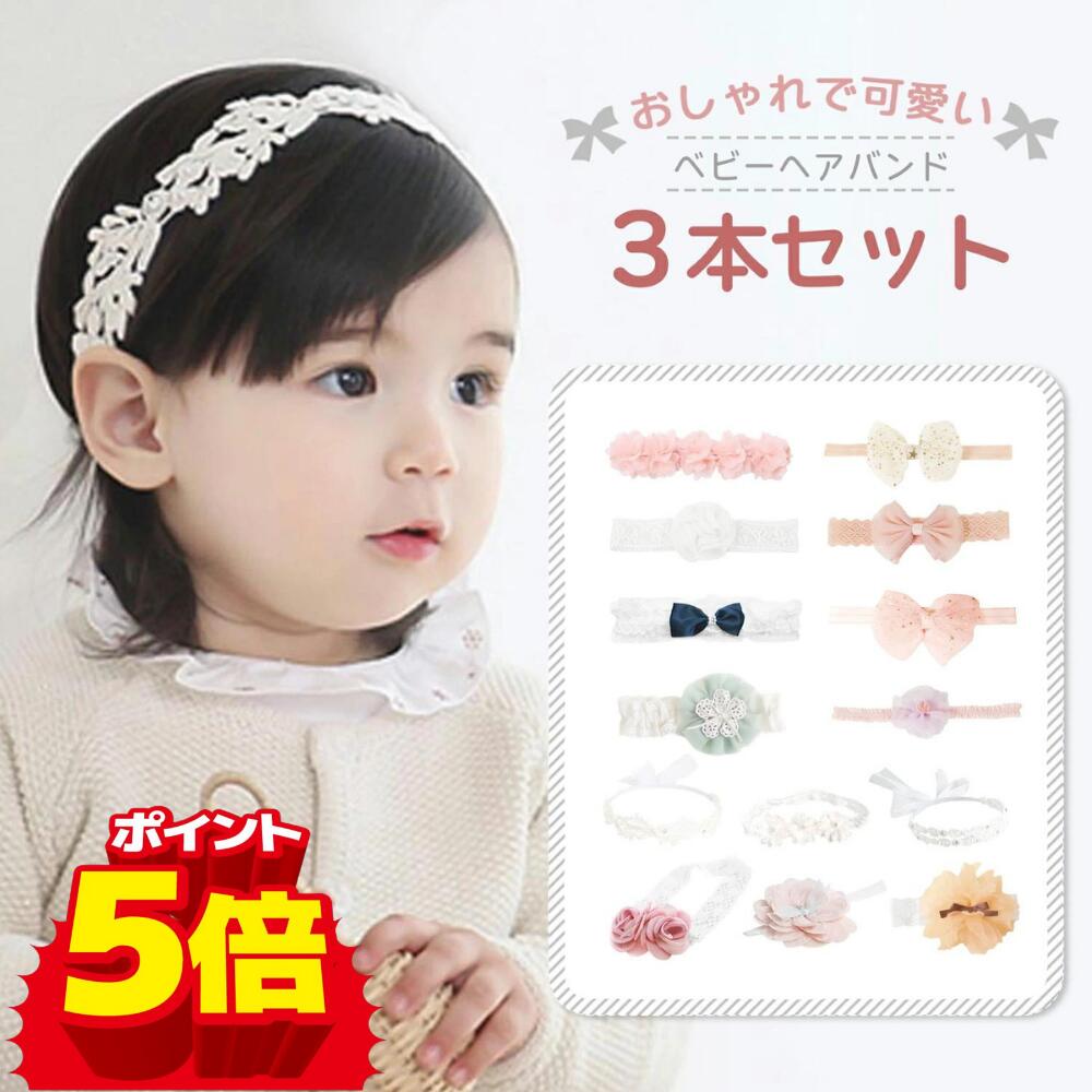 リボンやお花が可愛い♪3本セットの子ども用ヘアバンドです。ベビーからキッズまで安心して使える綿混素材です。